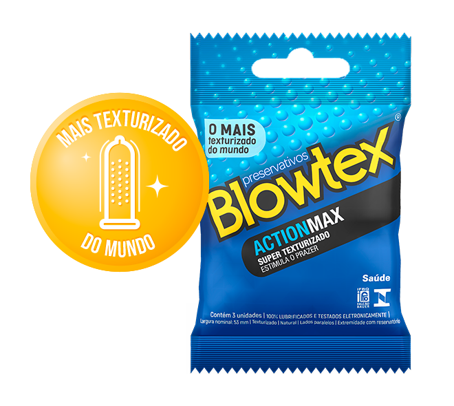 Blowtex ActionMax é o preservativo mais texturizado do mundo, perfeito para estimular o prazer na Hora H. As texturas em bolinhas na parte externa estimulam o seu par, enquanto o formato anatômico do preservativo promove o encaixe perfeito no pênis! Triplamente testado em testes elétrico, de vazamento e de integridade para garantir a melhor qualidade dos materiais.
